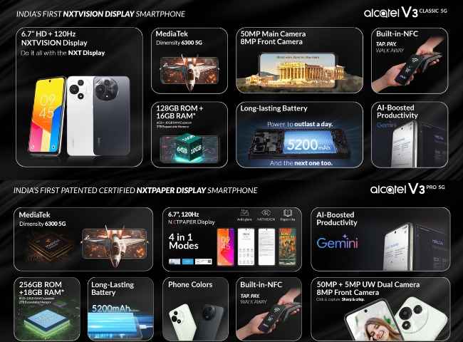 అల్కాటెల్ వి3 క్లాసిక్ మరియు వి3 ప్రో రెండు ఫోన్లు కూడా 6.67 ఇంచ్ స్క్రీన్ కలిగి ఉంటాయి. ఈ స్క్రీన్ పేపర్ లాంటి ఫీల్ అందించే NXTPAPER ఫీచర్ కలిగి ఉంటాయి. అంతేకాదు, HD+ రిజల్యూషన్ మరియు 2.5D Glass కలిగి ఉంటుంది. ఈ రెండు అల్కాటెల్ స్మార్ట్ ఫోన్స్ కూడా మీడియాటెక్ Dimensity 6300 5G చిప్ సెట్ తో పని చేస్తాయి. ఈ రెండు ఫోన్ లలో కూడా ఫిజికల్ ర్యామ్ తో పాటు 10GB అదనపు ర్యామ్ ఫీచర్ కూడా అందించింది.