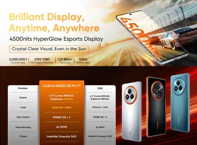 రియల్ మీ నార్జో 80 ప్రో స్మార్ట్ ఫోన్ మీడియాటెక్ Dimensity 7400 5G చిప్ సెట్ తో వచ్చిన సెగ్మెంట్ మొదటి స్మార్ట్ ఫోన్. ఈ స్మార్ట్ ఫోన్ కేవలం 7.55mm మందంతో చాలా స్లీక్ గా ఉంటుంది. ఈ ఫోన్ 4500 నిట్స్ పీక్ బ్రైట్నెస్ కలిగిన హైపర్ గ్లో AMOLED Esports స్క్రీన్ కలిగి ఉంటుంది. ఇది ఇన్ స్క్రీన్ ఫింగర్ ప్రింట్ సెన్సార్ మరియు 120Hz రిఫ్రెష్ రేట్ కలిగి ఉంటుంది. ఈ ఫోన్ 90 FPS BGMI కి సపోర్ట్ చేస్తుంది. ఈ ఫోన్ IP 69 రేటింగ్ తో మంచి వాటర్ ప్రూఫ్ ఫీచర్ కూడా కలిగి ఉంటుంది.