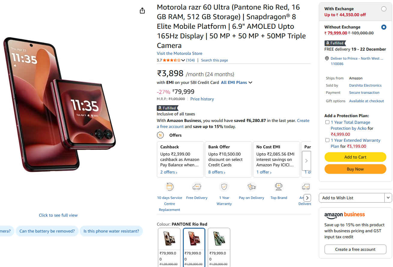 మోటోరోలా రేజర్ 60 అల్ట్రా స్మార్ట్ ఫోన్ ఇండియాలో రూ. 99,999 లాంచ్ అయ్యింది. అయితే, ఈ ఫోన్ పై ఈ రోజు అమెజాన్ అందించిన రూ. 20,000 డిస్కౌంట్ ఆఫర్ తో రూ. 79,999 ఆఫర్ ధరలో అమెజాన్ నుంచి లిస్ట్ అయ్యింది. అదనంగా, అమెజాన్ ఈరోజు ఈ ఫోన్ పై HDFC క్రెడిట్ కార్డ్ రూ. 10,500 అదనపు డిస్కౌంట్ ఆఫర్ అందించింది.
