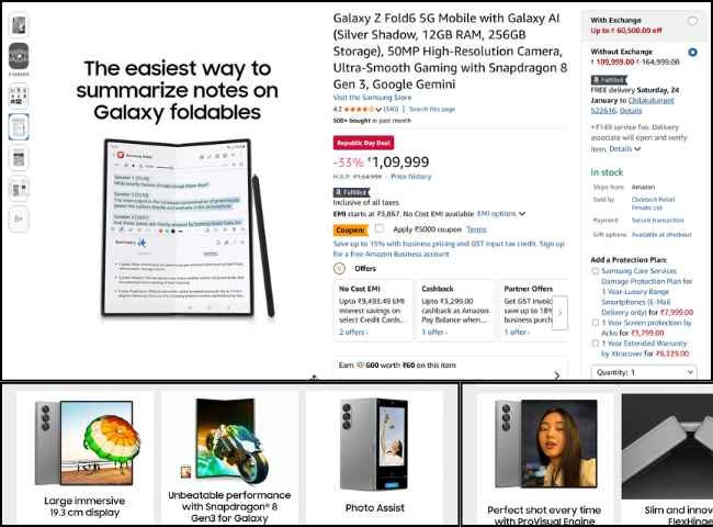 శాంసంగ్ భారత్ మార్కెట్లో విడుదల చేసిన ప్రీమియం స్మార్ట్ ఫోన్ గెలాక్సీ జెడ్ ఫోల్డ్ 6 పై అమెజాన్ మూడు బిగ్ డీల్స్ అందించింది. రేపటితో ముగినున్న అమెజాన్ గ్రేట్ రిపబ్లిక్ డే సెల్ నుంచి అందించింది. అంటే ఈ ఆఫర్ మీకు ఈరోజు మరియు రేపు రెండు రోజులు మాత్రమే అందుబాటులో ఉంటుంది. ఇక ఈ స్మార్ట్ ఫోన్ పై అమెజాన్ అందించిన ఆఫర్స్ విషయానికి వస్తే, ఈ ఫోన్ 2024 లో ఇండియన్ మార్కెట్లో రూ. 1,64,999 ధరతో లాంచ్ అయ్యింది. అయితే, ఈరోజు అమెజాన్ అందించిన 33% భారీ డిస్కౌంట్ తో రూ. 1,09,999 ధరతో లిస్ట్ అయ్యింది.