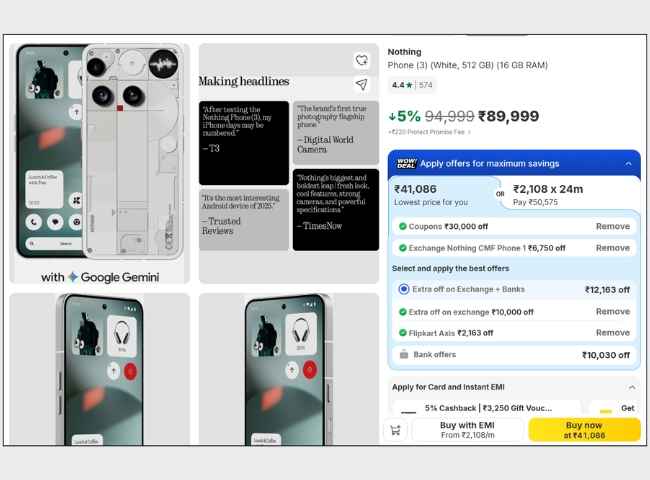 ఫ్లిప్ కార్ట్ సేల్ వాలంటైన్స్ డే సేల్ నుంచి ఈరోజు నథింగ్ ఫోన్ 3 (16GB + 512GB) హై ఎండ్ వేరియంట్ రూ. 89,999 రూపాయల ప్రైస్ ట్యాగ్ తో లిస్ట్ అయ్యింది. అంటే, ఈ ఫోన్ లాంచ్ ధరతోనే ఈరోజు ఫ్లిప్ కార్ట్ ఈ ఫోన్ ను లిస్ట్ చేసింది. అయితే, ఈ ఫోన్ పై మూడు ఆఫర్లు అందించడం ద్వారా ఈ ఫోన్ ను సగం ధరలో అందుకునే అవకాశం అందించింది.
