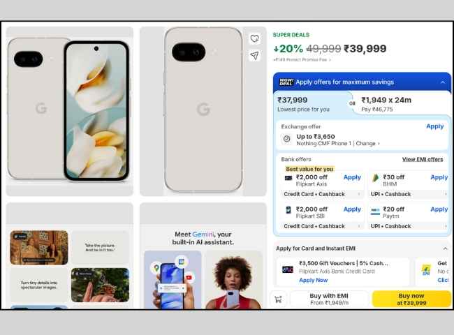 గూగుల్ పిక్సెల్ 9a స్మార్ట్ ఫోన్ ఇండియన్ మార్కెట్లో రూ. 49,999 ప్రైస్ ట్యాగ్ తో లాంచ్ అయ్యింది. అయితే, ఈ రోజు రూ. 10,000 రూపాయల భారీ డిస్కౌంట్ అందుకుని కేవలం రూ. 39,999 రూపాయల ఆఫర్ ధరలో లిస్ట్ అయ్యింది. ఇది కాకుండా ఈ ఫోన్ ను Flipkart SBI మరియు Flipkart Axis క్రెడిట్ కార్డ్స్ తో కొనుగోలు చేస్తే రూ. 2,000 అదనపు బ్యాంక్ డిస్కౌంట్ కూడా మీకు అందిస్తుంది. ఈ ఆఫర్ తో ఈ ఫోన్ ను కేవలం రూ. 37,999 ధరలో అందుకోవచ్చు.