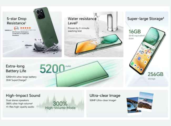 ఈ ఫోన్ యొక్క మరిన్ని ఇతర ఫీచర్స్ విషయానికి వస్తే, ఈ ఫోన్ లో 3x లాస్ లెస్ జూమ్ సపోర్ట్ కలిగిన 50MP అల్ట్రా క్లియర్ కెమెరా ఈ ఫోన్ కలిగి ఉంటుంది. ఇది క్లియర్ ఇమేజెస్ మరియు మంచి వీడియోలు అందించే సత్తా కలిగి ఉంటుందని హానర్ తెలిపింది. ఇది కాకుండా 300% హై వాల్యూమ్ సౌండ్ అందించే డ్యూయల్ స్టీరియో స్పీకర్ లను కూడా ఈ ఫోన్ కలిగి ఉంటుంది.