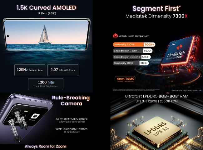 ఈ లావా ఫోన్ మీడియాటెక్ Dimensity 7300X చిప్ సెట్ జతగా 8GB LPDDR5 ర్యామ్ మరియు 128GB ఇంటర్నల్ స్టోరేజ్ కలిగి ఉంటుంది. ఈ ఫోన్ లో 66W ఫాస్ట్ ఛార్జ్ సపోర్ట్ కలిగిన 5000 mAh బ్యాటరీ కూడా ఉంటుంది.