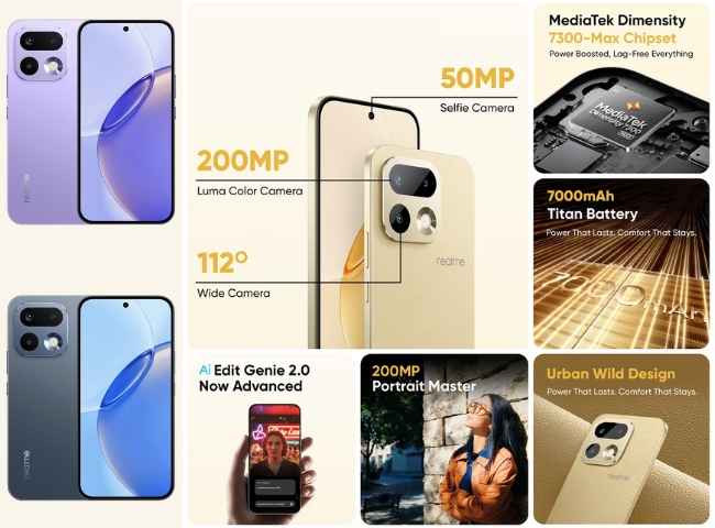 ఈ ఫోన్ లో జబర్దస్త్ కెమెరా సెటప్ తో ఉంటుంది. ఈ ఫోన్ లో వెనుక 200MP Luma Color మెయిన్ కెమెరా (డ్యూయల్ యాక్సిస్ OIS & EIS), 8MP వైడ్ యాంగిల్ కలిగిన రియర్ కెమెరా ఉంటుంది. అలాగే, ఈ ఫోన్ లో ముందు 50MP సెల్ఫీ కెమెరా కూడా ఉంటుంది. ఈ ఫోన్ సూపర్ స్టేబుల్ తో 4K వీడియో రికార్డింగ్ సపోర్ట్ తో వస్తుంది. అంతేకాదు, సూపర్ జూమ్ కలిగి ఉంటుంది మరియు ఎడిట్ కోసం Ai ఎడిట్ జీనీ 2.0 సపోర్ట్ కూడా కలిగి ఉంటుంది. ఈ రియల్ మీ ఫోన్ 7000 mAh బిగ్ టైటాన్ బ్యాటరీ మరియు 80W సూపర్ ఫ్లాష్ ఛార్జ్ సపోర్ట్ తో వస్తుంది. IP66, IP68, IP69 మరియు IP69K రేటింగ్ తో బెస్ట్ డస్ట్ అండ్ వాటర్ రెసిస్టెంట్ తో వస్తుంది.