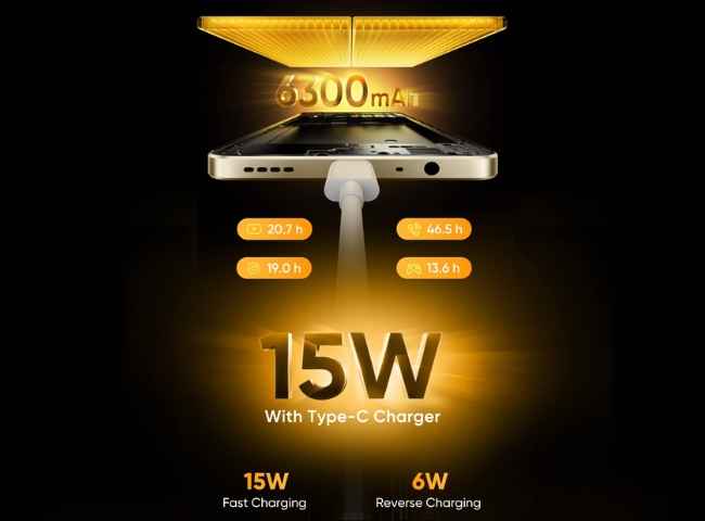 ఈ స్మార్ట్ ఫోన్ లో అందించిన ఛార్జ్ టెక్ గురించి కూడా రియల్ మీ వివరాలు అందించింది. ఈ ఫోన్ ను 15W ఫాస్ట్ ఛార్జింగ్ మరియు 6W రివర్స్ ఛార్జ్ సపోర్ట్ తో అందిస్తున్నట్టు రియల్ మీ తెలిపింది. ఈ ఫోన్ టైప్ ఛార్జ్ పోర్ట్ కలిగి ఉంటుంది. ఇందులో డ్యూయల్ రియర్ కెమెరా, HD డిస్ప్లే వంటి మరిన్ని ఫీచర్లు ఉండే అవకాశం ఉంటుంది.