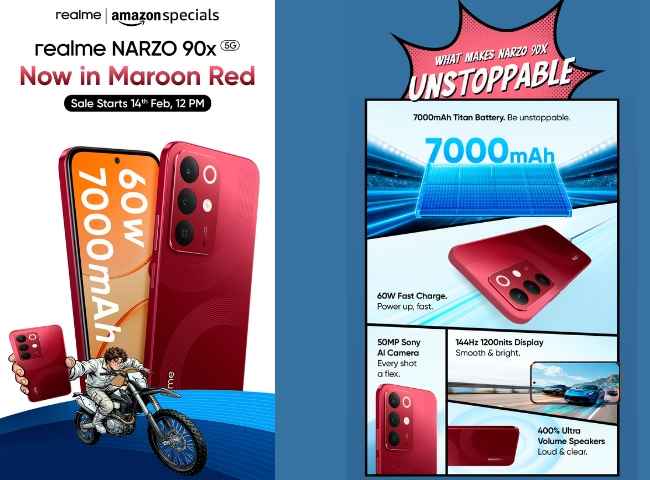 Realme narzo 90x స్మార్ట్ ఫోన్ ఇప్పుడు కొత్త కలర్ వేరియంట్ కూడా లాంచ్ అయ్యింది. వాలెంటైన్స్ డే సందర్భంగా ఈ ఫోన్ సరికొత్త మెరూన్ కలర్ వేరియంట్ ను రియల్మీ విడుదల చేసింది. ఈ ఫోన్ గత సంవత్సరం మే నెలలో ఇండియాలో లాంచ్ అయ్యింది. అయితే, 2026 వాలెంటైన్స్ డే సందర్భంగా ప్రత్యేకంగా మెరూన్ కలర్ వేరియంట్ ను ఇప్పుడు లాంచ్ చేసింది. ఈ ఫోన్ బడ్జెట్ ధరలో ఆకట్టుకుంటుంది మరియు ఇప్పుడు కొత్త రంగుల్లో కూడా లభిస్తుంది.