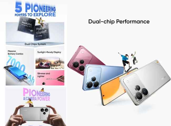 ఈ ఫోన్ 50MP AI మెయిన్ కెమెరా మరియు 8MP సెకండరీ కెమెరా కలిగిన ట్రిపుల్ రియర్ కెమెరా కలిగి ఉంటుంది. ఈ ఫోన్ ఎఐ జీని, ఎఐ ట్రావెల్ స్నాప్ వంటి చాలా ఎఐ కెమెరా ఫీచర్లు కలిగి ఉంటుంది. ఈ ఫోన్ 4K వీడియో రికార్డింగ్ సపోర్ట్ కూడా కలిగి ఉంటుంది. ఈ ఫోన్ కేవలం 7.58mm మందంతో చాలా స్లీక్ గా ఉంటుంది. అయితే, ఈ ఫోన్ 7000 mAh టైటాన్ బ్యాటరీ కలిగి ఉంటుంది. ఈ బ్యాటరీ 80W అల్ట్రా ఛార్జ్ సపోర్ట్ కూడా కలిగి ఉంటుంది. అంతేకాదు, ఈ ఫోన్ 12.5W ఫాస్ట్ ఛార్జ్ సపోర్ట్ కూడా కలిగి ఉంటుంది.