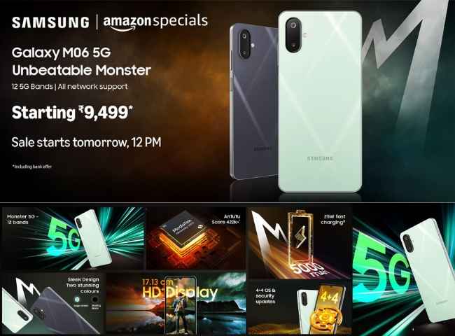 శామ్సంగ్ గెలాక్సీ M06 5జి స్మార్ట్ ఫోన్ ను రూ. 9,999 రూపాయల ప్రారంభ ధరతో లాంచ్ చేసింది. ఈ ఫోన్ 4GB + 128GB స్టోరేజ్ వేరియంట్ ను ఈ ప్రైస్ ట్యాగ్ తో అందించింది. ఈ ఫోన్ యొక్క రెండవ వేరియంట్ 6GB + 128GB ను రూ. 11,499 రూపాయల ధరతో లాంచ్ చేసింది. అయితే, ఈ ఫోన్ ను సేల్ నుంచి బ్యాంక్ ఆఫర్స్ తో కేవలం రూ. 9,499 మరియు రూ. 10,999 రూపాయల ఆఫర్ ధరకే అందుకోవచ్చని తెలిపింది. ఈ ఫోన్ అమెజాన్ ఇండియా నుంచి లభిస్తుంది.