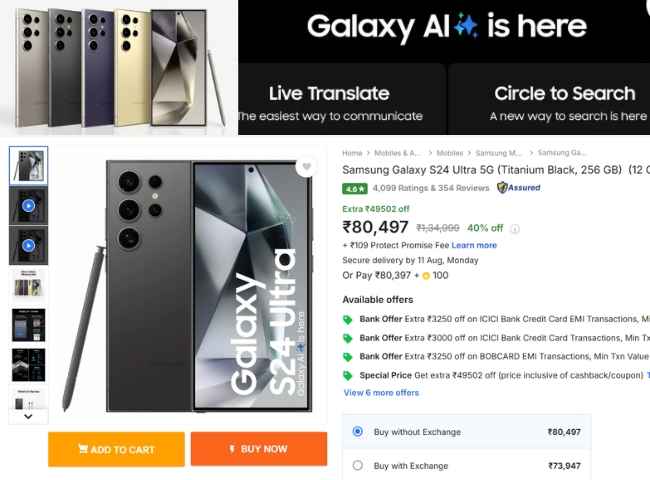 2024 లో శాంసంగ్ ప్రీమియం సిరీస్ గెలాక్సీ నుంచి అందించిన ప్రీమియం స్మార్ట్ ఫోన్ శాంసంగ్ గెలాక్సీ S24 అల్ట్రా స్మార్ట్ ఫోన్ ఈరోజు ఫ్లిప్ కార్ట్ నుంచి బిగ్ డిస్కౌంట్ ఆఫర్స్ అందుకుంది. శాంసంగ్ ఈ ఫోన్ బేసిక్ మోడల్ ను ఇండియాలో రూ. 1,34,999 రూపాయల ధరతో లాంచ్ చేసింది. అయితే, గెలాక్సీ S25 సిరీస్ లాంచ్ తర్వాత ఈ ఫోన్ ధర తగ్గించింది. అయితే, ఈ ఫోన్ ఈరోజు ఫ్లిప్ కార్ట్ నుంచి 40% భారీ డిస్కౌంట్ అందుకుని రూ. 80,497 ఆఫర్ ప్రైస్ ట్యాగ్ తో లిస్ట్ అయ్యింది.