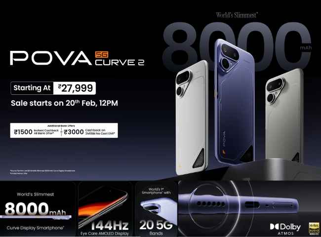 Tecno Pova Curve 2 5G: చాలా రోజులుగా టెక్నో టీజింగ్ చేస్తున్న బిగ్ బ్యాటరీ ఫోన్ ను ఎట్టకేలకు ఈరోజు ఇండియన్ మార్కెట్లో విడుదల చేసింది. అదే టెక్నో పోవా కర్వ్ 2 స్మార్ట్ ఫోన్ మరియు ఈ ఫోన్ ను ఈ ప్రైస్ సెగ్మెంట్ లో 8000 mAh మోర్ బ్యాటరీ మరియు 20 5G బ్యాండ్స్ సపోర్ట్ తో మోర్ సిగ్నల్ వంటి మరిన్ని ఆకట్టుకునే ఫీచర్స్ తో లాంచ్ చేసింది. ఈ లేటెస్ట్ స్మార్ట్ ఫోన్ ధర మరియు ఫీచర్స్ ఎలా ఉన్నాయో వివరంగా తెలుసుకోండి.