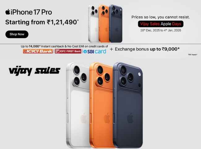 Vijay Sales కొత్తగా యాపిల్ డేస్ సేల్ ను అనౌన్స్ చేసింది. ఈ సేల్ 2025 క్లోజింగ్ మరియు న్యూ ఇయర్ స్టార్టింగ్ రోజుల్లో కొనుగోలుదారులకు అందుబాటులో ఉంటుంది. విజయ్ సేల్స్ కొత్తగా అందించిన ఈ సేల్ నుంచి iPhone 17 Pro పై భారీ డీల్స్ అనౌన్స్ చేసింది. మీరు కూడా యాపిల్ లేటెస్ట్ సిరీస్ ఐఫోన్ కొనాలని సెర్చ్ చేస్తుంటే, ఈ కొత్త సేల్ నుంచి లభిస్తున్న ఐఫోన్ 17 ప్రో డీల్ పరిశీలించవచ్చు.