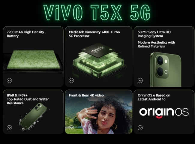 ప్రముఖ చైనీస్ స్మార్ట్ ఫోన్ బ్రాండ్ వివో ఈరోజు తన T సిరీస్ నుంచి 2026 లేటెస్ట్ ఫోన్ Vivo T5x 5G ను రిలీజ్ చేసింది. ఈ ఫోన్ లాంచ్ అయిన ప్రైస్ సెగ్మెంట్ లో ఎప్పుడూ చూడని స్టన్నింగ్ ఫీచర్స్ తో ఈ వివో లాంచ్ అయ్యింది. ఈ ఫోన్ ను మిడ్ రేంజ్ సెగ్మెంట్ లో పవర్ఫుల్ ఫీచర్లతో అందించింది. ముఖ్యంగా, ఈ ఫోన్ ను 7200 mAh భారీ బ్యాటరీ మరియు 1 Mn+ AnTuTu అందించే లేటెస్ట్ ప్రోసెసర్ వంటి ఆకర్షణీయమైన ఫీచర్స్ తో అందించింది.