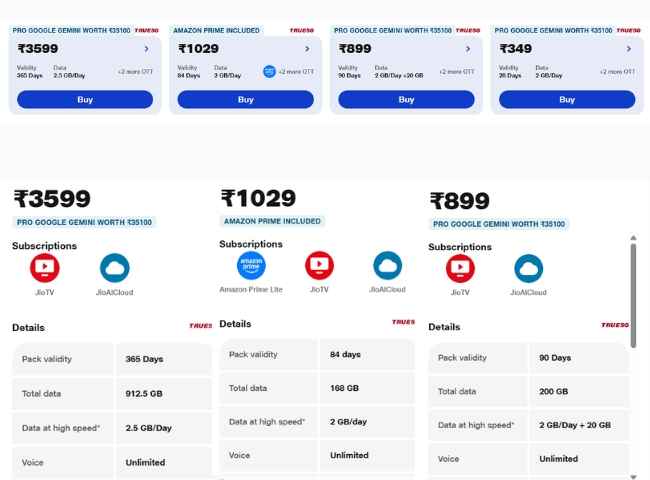 జియో సైట్ నుంచి ఈ బెస్ట్ ప్లాన్స్ గురించి లిస్ట్ అందించింది. వీటిలో నాలుగు అన్లిమిటెడ్ ప్రీపెయిడ్ ప్లాన్స్ ఉన్నాయి. ఇక ఈ ప్రీపెయిడ్ ప్లాన్స్ విషయానికి వస్తే, ఇందులో రూ. 349, రూ. 899, రూ. 1,029 మరియు రూ. 3,599 రూపాయల నాలుగు ప్రీపెయిడ్ ప్లాన్స్ ఉన్నాయి. ఈ అన్ని ప్లాన్స్ కూడా రూ. 35,100 రూపాయల విలువైన గూగుల్ జెమినీ Ai ప్రో యాక్సెస్ కూడా తీసుకొస్తాయి. ఈ నాలుగు ప్రీపెయిడ్ ప్లాన్స్ కూడా అందించే బెనిఫిట్స్ ఇప్పుడు చూద్దాం.