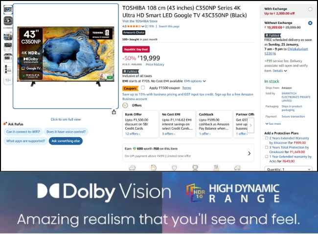 TOSHIBA రీసెంట్ గా విడుదల చేసిన 43 ఇంచ్ C350NP స్మార్ట్ టీవీ పై అమెజాన్ అందించిన డీల్స్ తో ఈ స్మార్ట్ టీవీ 16 వేల ప్రైస్ సెగ్మెంట్ లో లభిస్తుంది. ఒక ఆఫర్స్ విషయానికి వస్తే, ఈ టీవీ ఈరోజు అమెజాన్ అందించిన 50% డిస్కౌంట్ తో ఈ స్మార్ట్ టీవీ రూ. 19,999 ధరతో అమెజాన్ సేల్ నుంచి కి అందుబాటులోకి వచ్చింది.