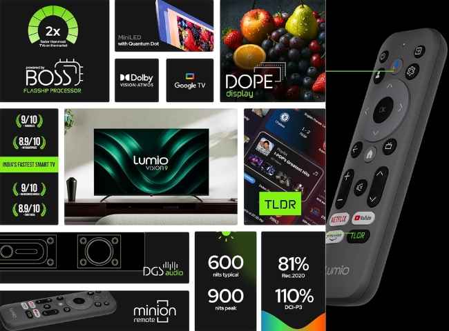 ఈ లుమియో 55 ఇంచ్ క్యూడి – మినీ ఎల్ఈడి స్మార్ట్ టీవీ వేగవంతమైన BOSS Processor తో పని చేస్తుంది మరియు జతగా 3GB DDR4 ర్యామ్ తో పాటు 32GB ఇంటర్నల్ స్టోరేజ్ కలిగి ఉంటుంది. ఈ టీవీ 55 ఇంచ్ క్వాంటం డాట్ ఎన్ హెన్స్మెంట్ ఫిల్మ్ DOPE స్క్రీన్ కలిగి ఉంటుంది. ఇది 900 గరిష్ఠమైన బ్రైట్నెస్ మరియు డాల్బీ విజన్ సపోర్ట్ తో అద్భుతమైన విజువల్స్ అందిస్తుంది. ఈ స్క్రీన్ 160 డిమ్మింగ్ జోన్, HDR10, HLG, MEMC మరియు 4K AI అప్ స్కేలింగ్ వంటి అదనపు ఫీచర్స్ కూడా కలిగి ఉంటుంది.