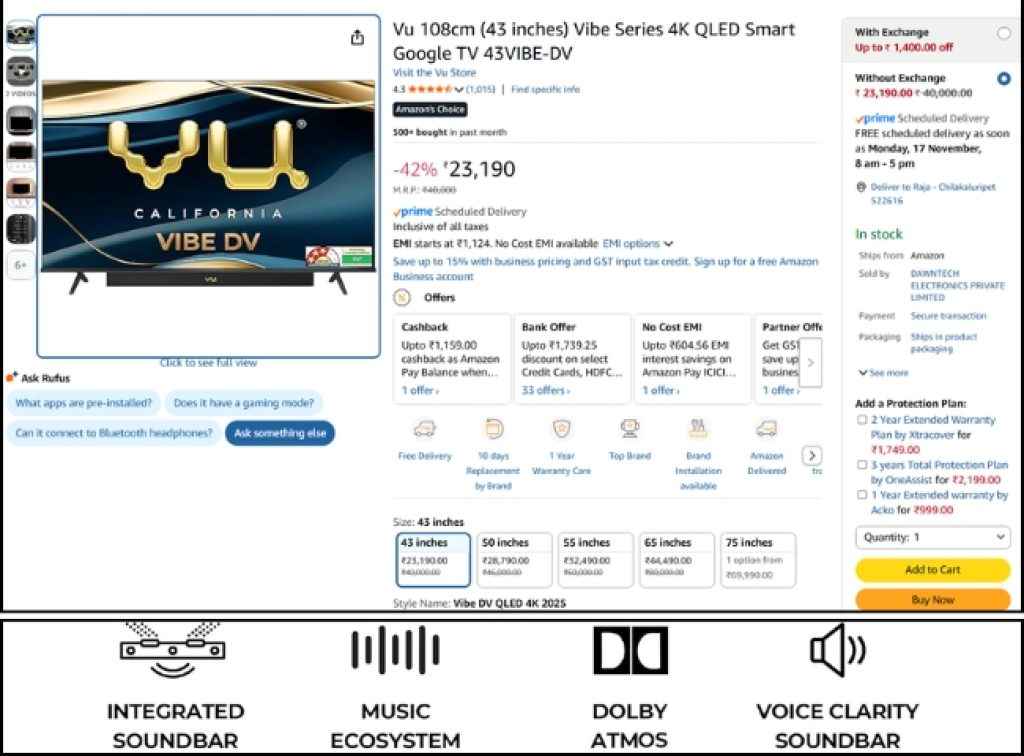 ఈ టీవీ డాల్బీ అట్మాస్ సౌండ్ టెక్నాలజీ సపోర్ట్ కలిగిన ఇంటిగ్రేటెడ్ బిల్ట్ ఇన్ సౌండ్ బార్ తో వస్తుంది. ఈ టీవీ టోటల్ 88W సౌండ్ అవుట్ పుట్ అందిస్తుంది. ఈ టీవీ డైలాగ్ క్లారిటీ మరియు డీప్ బాస్ సౌండ్ అందించడమే కాకుండా ఆడియో ఓన్లీ ఫీచర్ తో కూడా వస్తుంది. ఈ టీవీ డ్యూయల్ బ్యాండ్ Wi-Fi, HDMI, USB, AV ఇన్, ఆప్టికల్, ఈథర్నెట్ వంటి మరిన్ని కనెక్టివిటీ సపోర్ట్ కలిగి ఉంటుంది. ఈ టీవీ అమెజాన్ ఇండియా యూజర్ల నుంచి 4.3 స్టార్ రేటింగ్ మరియు మంచి రివ్యూలు అందుకుంది.