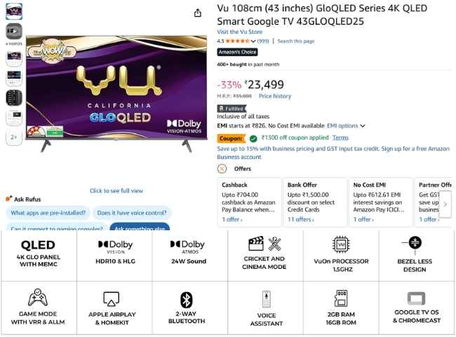 వియు గ్లో ఎల్ఈడి సిరీస్ నుంచి రీసెంట్ గా అందించిన 43 ఇంచ్ స్మార్ట్ టీవీ మోడల్ నెంబర్ 43 GLOQLED25 ఈరోజు అమెజాన్ నుంచి 33% డిస్కౌంట్ ఆఫర్ తో రూ. 23,499 ప్రైస్ ట్యాగ్ తో లిస్ట్ అయ్యింది. ఈ డిస్కౌంట్ తో పటు మరో రెండు డిస్కౌంట్ ఆఫర్స్ కూడా అమెజాన్ ఈ టీవీ పై అందించింది.