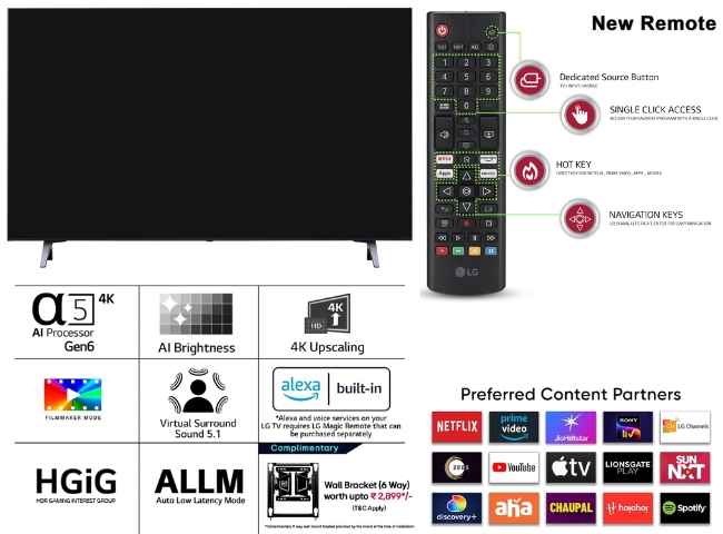ఈ ఎల్ జి స్మార్ట్ టీవీ AI ThinQ మరియు WebOS పై నడుస్తుంది. ఈ స్మార్ట్ టీవీ AI Sound సపోర్ట్ కలిగిన 2.0 ఛానల్ 20W సౌండ్ అవుట్ తో మంచి సౌండ్ అందిస్తుంది. ఈ స్మార్ట్ టీవీ స్లిమ్ డిజైన్ తో ఆకట్టుకుంటుంది. ఈ స్మార్ట్ టీవీ HDMI eARC, Bluetooth 5.0, ఆప్టికల్, ఈథర్నెట్, USB మరియు ఇన్ బిల్ట్ Wi-Fi వంటి అన్ని కనెక్టివిటీ సపోర్ట్ లను కలిగి ఉంటుంది.