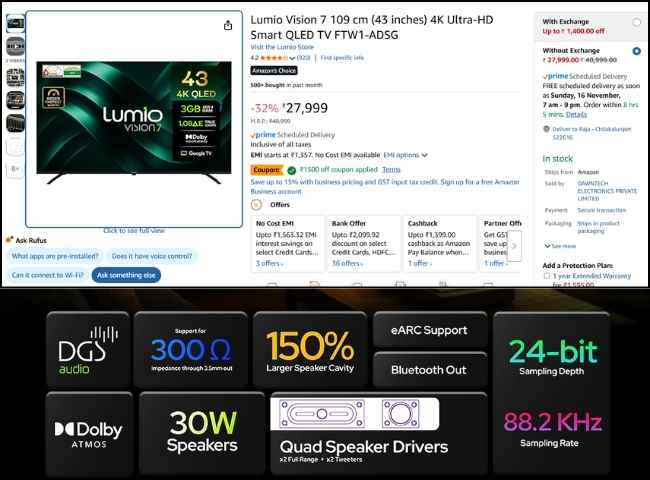 ప్రముఖ స్మార్ట్ టీవీ బ్రాండ్ Lumio ఇటీవల ఇండియాలో Vision 7 సిరీస్ నుంచి విడుదల చేసిన 43 ఇంచ్ క్యూలెడ్ స్మార్ట్ టీవీ పై అమెజాన్ అందించిన డీల్స్ గురించే మనం ఇప్పుడు చెప్పుకుంటోంది. ఈ స్మార్ట్ టీవీ ఇండియాలో రూ. 27,999 ధరతో లాంచ్ అయ్యింది మరియు రోజు కూడా అమెజాన్ నుంచి ఇదే ధరతో సేల్ అవుతోంది. అయితే, ఈ రోజు అమెజాన్ అందించిన రెండు బిగ్ డీల్స్ తో ఈ స్మార్ట్ టీవీ చవక ధరలో లభిస్తుంది.