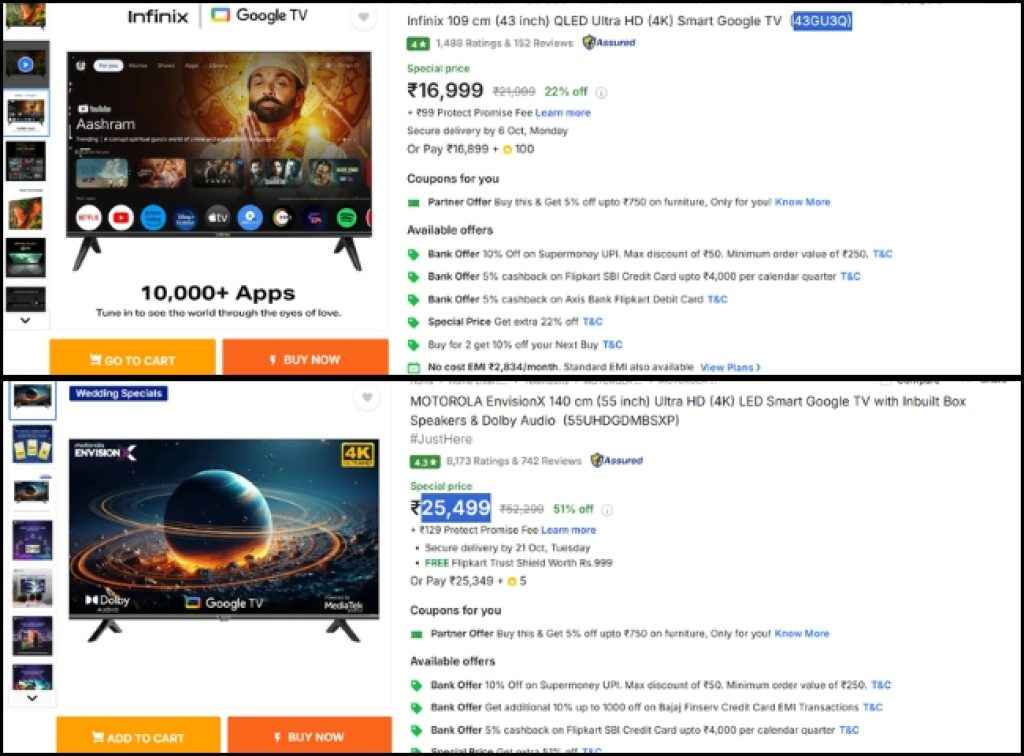 ఫ్లిప్ కార్ట్ బిగ్ బిలియన్ డేస్ నుంచి ఈరోజు ఇన్ఫినిక్స్ మరియు మోటోరోలా స్మార్ట్ టీవీలు చాలా చౌక ధరలో లభిస్తున్నాయి. ఈ టీవీ డీల్స్ గురించే మనం ఇప్పుడు మాట్లాడుకుంటుంది. ఫ్లిప్ కార్ట్ అందించిన బిగ్ డీల్స్ తో 15 వేలకే 43 ఇంచ్ మరియు 23 వేలకే 55 ఇంచ్ స్మార్ట్ టీవీ లభిస్తున్నాయి. ఈ డీల్స్ వివరాలు ఇప్పుడు చూద్దాం.