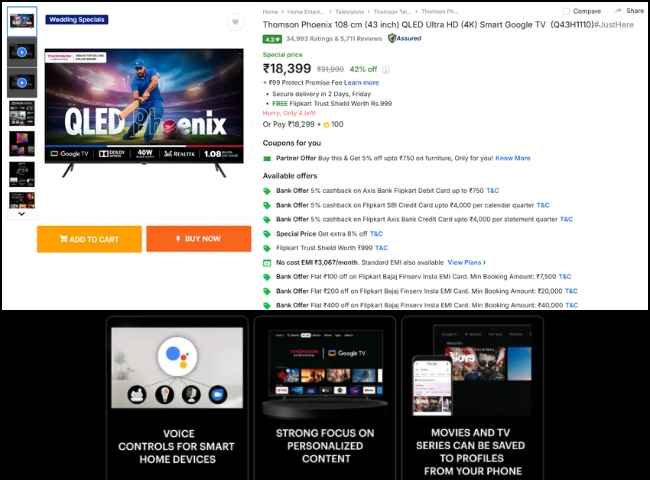 Thomson Phoenix సిరీస్ నుంచి విడుదల చేసిన లేటెస్ట్ 43 ఇంచ్ క్యూలెడ్ స్మార్ట్ టీవీ ఈరోజు ఈ ఆఫర్ ధరలో లభిస్తుంది. ఈ స్మార్ట్ టీవీ ఈరోజు ఫ్లిప్ కార్ట్ నుంచి 43% భారీ డిస్కౌంట్ తో రూ. 18,399 ఆఫర్ ధరతో సేల్ అవుతోంది. అంతేకాదు, ఈ క్యూలెడ్ స్మార్ట్ టీవీని ఈరోజు ఫ్లిప్ కార్ట్ నుంచి Flipkart Axis బ్యాంక్ లేదా SBI క్రెడిట్ కార్డు తో తీసుకునే వారికి రూ. 919 రూపాయల అదనపు డిస్కౌంట్ లభిస్తుంది. ఈ ఆఫర్ తో ఈ స్మార్ట్ టీవీ కేవలం రూ. 17,479 రూపాయల అతి తక్కువ ధరకు లభిస్తుంది. మీ ఈ న్యూస్ అందించే సమయానికి కేవలం 4 టీవీలు మాత్రమే స్టాక్ లో ఉన్నాయి. కాబట్టి ఈ ఆఫర్ స్టాక్ ఉన్నంత వరకు మాత్రమే అని గమనించాలి.