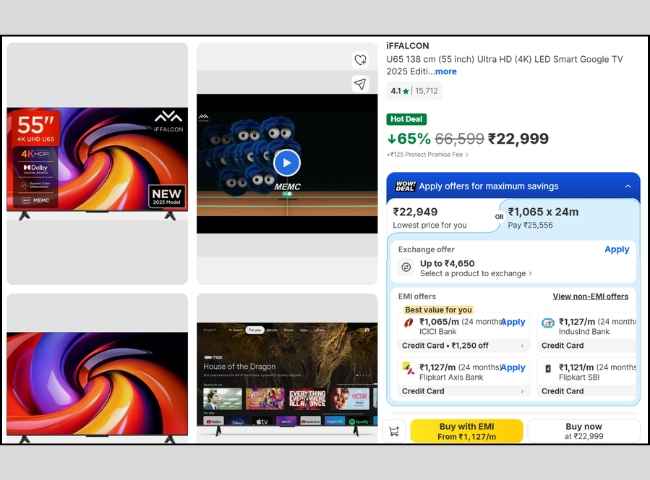 ప్రముఖ స్మార్ట్ టీవీ బ్రాండ్ TCL యొక్క ఉప బ్రాండ్ iFFALCON యొక్క 55 ఇంచ్ స్మార్ట్ టీవీ ఈరోజు ఈ బిగ్ డిస్కౌంట్ ధరలో లభిస్తుంది. ఈ స్మార్ట్ టీవీ ఈరోజు ఫ్లిప్ కార్ట్ అందించిన 65%భారీ డిస్కౌంట్ ఆఫర్ తో కేవలం రూ. 22,999 రూపాయల డిస్కౌంట్ ధరలో సేల్ అవుతోంది. ఈ స్మార్ట్ టీవీని అతి తక్కువ EMI తో అందుకునే అవకాశం కూడా ఫ్లిప్ కార్ట్ అందించింది. ఈ స్మార్ట్ టీవీ తో జతగా సౌండ్ బార్ తీసుకునే వారికి రూ. 1,000 రూపాయల డిస్కౌంట్ కూపన్ ఆఫర్ లభిస్తుంది.