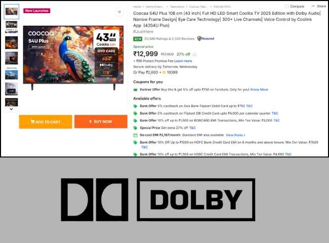 2025 సంవత్సరం మధ్యలో Coocaa S4U Plus సిరీస్ నుంచి కొత్తగా విడుదల చేసిన లేటెస్ట్ 43 ఇంచ్ FHD స్మార్ట్ టీవీ ని ఈరోజు ఫ్లిప్ కార్ట్ ఈ డిస్కౌంట్ ధరతో ఆఫర్ చేస్తోంది. ఈ టీవీ ఈరోజు ఫ్లిప్ కార్ట్ సేల్ నుంచి 27% డిస్కౌంట్ తో కేవలం రూ. 12,999 రూపాయల ఆఫర్ ధరలో సేల్ అవుతోంది. ఈ డిస్కౌంట్ ధరతో పాటు ఈ ఫోన్ పై 10% అదనపు బ్యాంక్ డిస్కౌంట్ కూడా ఫ్లిప్ కార్ట్ అందించింది. ఈ టీవీని BOB CARD EMI, HDFC మరియు HSBC క్రెడిట్ కార్డ్ తో తీసుకునే వారికి ఈ డిస్కౌంట్ లభిస్తుంది. ఈ ఆఫర్ తో ఈ స్మార్ట్ టీవీ కేవలం రూ. 11,700 రూపాయల ఆఫర్ ధరకే లభిస్తుంది.