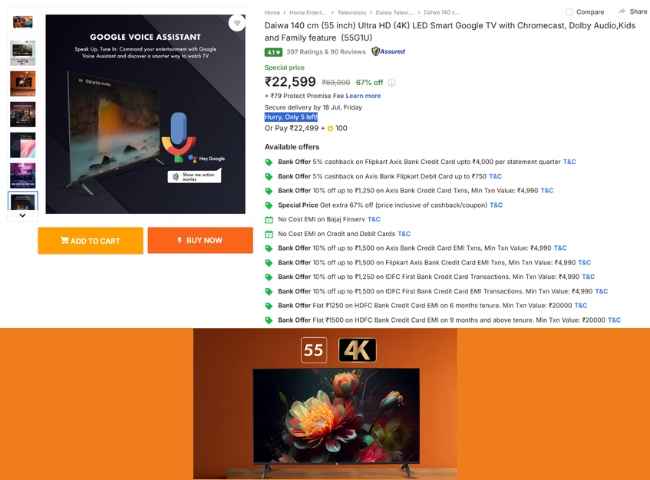 మేము ఈ వార్తలను అందించే సమయానికి ఫ్లిప్ కార్ట్ లో ఈ టీవీ యొక్క 5 సెట్స్ మాత్రమే అందుబాటులో ఉన్నాయి. ఈ ఐదు సెట్స్ అమ్మడు అయితే ఈ ఆఫర్ కూడా క్లోజ్ అవుతుంది.