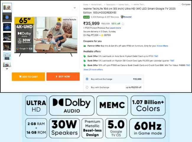 ఈరోజు లభిస్తున్న ఈ స్మార్ట్ టీవీ గురించి చెప్పాలంటే, రియల్ మీ టెక్ లైఫ్ రీసెంట్ గా విడుదల చేసిన 65 ఇంచెస్ స్మార్ట్ టీవీ మోడల్ నెంబర్ 65UHDGDRDDVB ఈ రోజు ఈ ధరలో లభిస్తుంది. ఈ స్మార్ట్ టీవీ ఫ్లిప్ కార్ట్ నుంచి ఈ బడ్జెట్ ధరలో లభిస్తుంది. ఈరోజు ఈ టీవీ ఫ్లిప్ కార్ట్ అందించిన 55% భారీ డిస్కౌంట్ తో రూ. 35,999 ధరతో సేల్ అవుతోంది. ఇది కాకుండా ఈ స్మార్ట్ టీవీ పై రూ. 1,500 రూపాయల అదనపు బ్యాంక్ డిస్కౌంట్ కూడా అందిస్తుంది. ఈ టీవీని BOB CARD, Canara మరియు SBI క్రెడిట్ కార్డు తో ఈ టీవీ తీసుకునే వారికి ఈ డిస్కౌంట్ లభిస్తుంది. ఈ ఆఫర్స్ తో ఈ టీవీ మీకు కేవలం రూ. 34,499 ధరకు లభిస్తుంది.