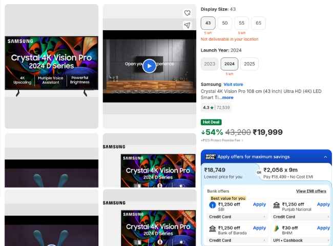 2024 సంవత్సరంలో శాంసంగ్ అందించిన 43 ఇంచ్ స్మార్ట్ టీవీ క్రిస్టల్ 4K విజన్ ప్రో స్మార్ట్ టీవీ ఈరోజు ఫ్లిప్ కార్ట్ నుంచి ఈ డీల్ అందించింది. ఈ స్మార్ట్ టీవీ పై ఫ్లిప్ కార్ట్ 54% భారీ డిస్కౌంట్ అందించింది. అందుకే, ఈ స్మార్ట్ టీవీ కేవలం రూ. 19,999 రూపాయల ఆఫర్ ధరలో ఫ్లిప్ కార్ట్ నుంచి లిస్ట్ అవుట్ అయ్యింది.