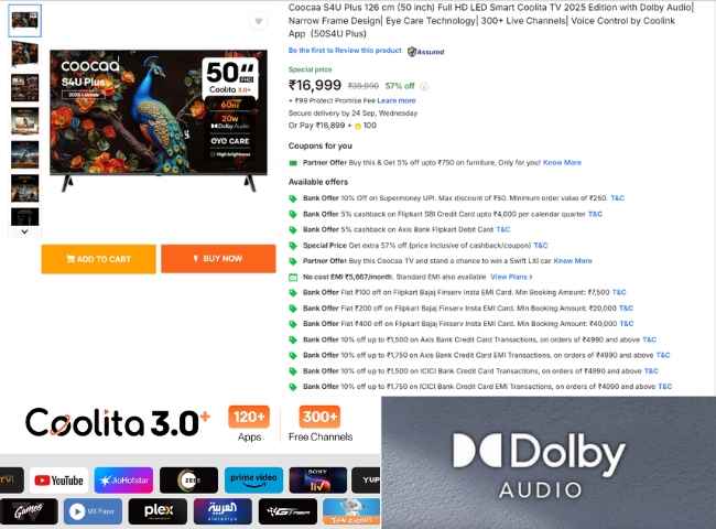 Coocaa కొత్తగా విడుదల చేసిన లేటెస్ట్ 50 ఇంచ్ FHD స్మార్ట్ టీవీ S4U Plus ఈరోజు ఫ్లిప్ కార్ట్ నుంచి ఈ డిస్కౌంట్ ధరలో లభిస్తుంది. ఈ స్మార్ట్ టీవీ ఈరోజు ఫ్లిప్ కార్ట్ అందించిన 57% భారీ డిస్కౌంట్ తో రూ. 16,999 రూపాయల ఆఫర్ ధరతో సేల్ అవుతోంది. ఈ స్మార్ట్ టీవీని Axis, ICICI మరియు HDFC బ్యాంక్ కార్డ్ తో కొనుగోలు చేసే వారికి రూ. 1,699 రూపాయల అదనపు డిస్కౌంట్ కూడా లభిస్తుంది.