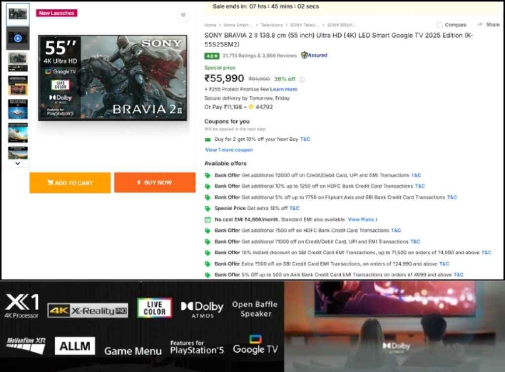 ముందుగా ఫ్లిప్ కార్ట్ సేల్ విషయానికి వస్తే, ఈ సేల్ ఈరోజు అర్ధరాత్రి తో ముగుస్తుంది. అందుకే, ఈ ఆఫర్ మీకు కేవలం ఈరోజు ఒక్కరోజు మాత్రమే అందుబాటులో ఉంటుంది. ఇక టీవీ డీల్ విషయానికి వస్తే, సోనీ బ్రావియా 2 సిరీస్ 55 ఇంచ్ స్మార్ట్ టీవీ K-55S25EM2 పై ఈరోజు ఫ్లిప్ కార్ట్ ఈ డీల్స్ అందించింది. ఈ టీవీని ఈరోజు 39% భారీ డిస్కౌంట్ తో రూ. 55,990 ఆఫర్ ధరతో సేల్ చేస్తోంది.