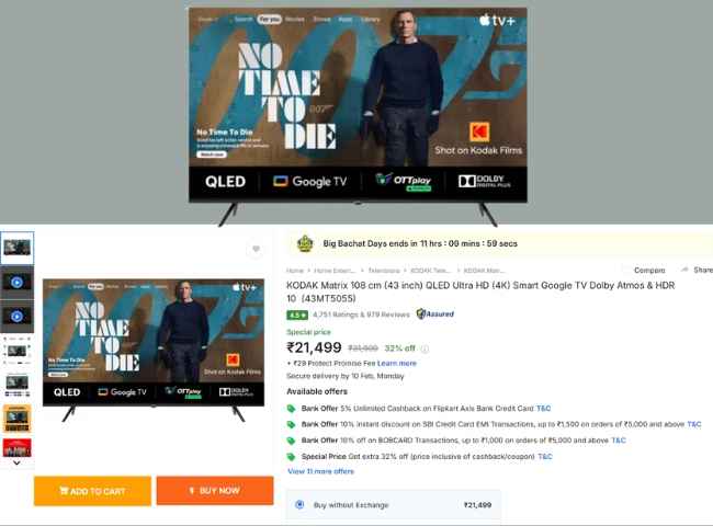 ఈ కోడాక్ టీవీ ఈరోజు ఫ్లిప్ కార్ట్ బిగ్ బచాత్ సేల్ నుంచి 32% డిస్కౌంట్ తో రూ. 21,499 ధరతో లభిస్తోంది. అయితే, ఈ స్మార్ట్ టీవీని SBI మరియు HDFC క్రెడిట్ కార్డు తో కొనే వారికి రూ. 1,500 డిస్కౌంట్ కూడా లభిస్తుంది. ఈ ఆఫర్ తో ఈ టీవీ కేవలం రూ. 19,999 ధరకు లభిస్తుంది.
