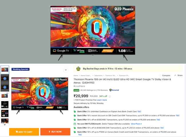 ఈ థాంసన్ క్యూలెడ్ స్మార్ట్ టీవీ ఈరోజు ఫ్లిప్ కార్ట్ సేల్ నుంచి 34% డిస్కౌంట్ తో రూ. 20,999 ప్రైస్ తో లిస్ట్ అయ్యింది. ఈ టీవీని SBI మరియు HDFC క్రెడిట్ కార్డ్ ఆప్షన్ తో కొనుగోలు చేసే వారికి రూ. 1,500 డిస్కౌంట్ కూడా లభిస్తుంది. ఈ ఆఫర్ తో ఈ స్మార్ట్ టీవీ కేవలం రూ. 19,499 రూపాయల ధరకు లభిస్తుంది.