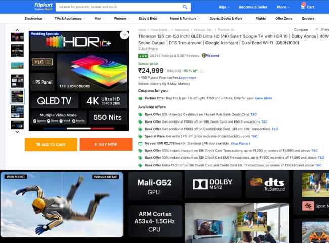 ప్రముఖ స్మార్ట్ టీవీ బ్రాండ్ Thomson లేటెస్ట్ గా అందించిన Q50H1000 మోడల్ స్మార్ట్ టీవీ పై ఫ్లిప్ కార్ట్ ఈ డీల్స్ అందించింది. ఈ స్మార్ట్ టీవీ ఈరోజు ఫ్లిప్ కార్ట్ సేల్ నుంచి 50% భారీ డిస్కౌంట్ తో రూ. 24,999 ధరకే సేల్ అవుతోంది. ఇది కాకుండా ఈ స్మార్ట్ టీవీ పై రూ. 1,500 రూపాయల బ్యాంక్ డిస్కౌంట్ ఆఫర్ కూడా అందించింది.