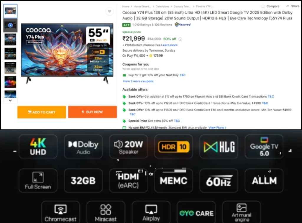ఫ్లిప్ కార్ట్ రిపబ్లిక్ డే సేల్ నుంచి ఈ డీల్ మీకు అందుబాటులో ఉంది. ఇక డీల్ విషయానికి వస్తే, ఇండియన్ మార్కెట్లో రీసెంట్ గా విడుదలైన Coocaa Y74 Plus 55 ఇంచ్ 4కె స్మార్ట్ టీవీ గొప్ప డీల్స్ తో ఈ ధరలో లభిస్తుంది. ఈ టీవీ ఈరోజు ఫ్లిప్ కార్ట్ అందించిన 60% భారీ డిస్కౌంట్ తో కేవలం రూ. 21,999 ప్రైస్ ట్యాగ్ తో లభిస్తోంది. ఈ టీవీ పై గొప్ప బ్యాంక్ డిస్కౌంట్ ఆఫర్స్ కూడా ఫ్లిప్ కార్ట్ సేల్ నుంచి అందించింది. టీవీని HDFC బ్యాంక్ క్రెడిట్ కార్డ్ తో కొనుగోలు చేసే యూజర్లకు 10% అదనపు డిస్కౌంట్ లభిస్తుంది. ఈ ఆఫర్ తో ఈ స్మార్ట్ టీవీ కేవలం రూ. 20,499 ధరలో మీకు లభిస్తుంది.
