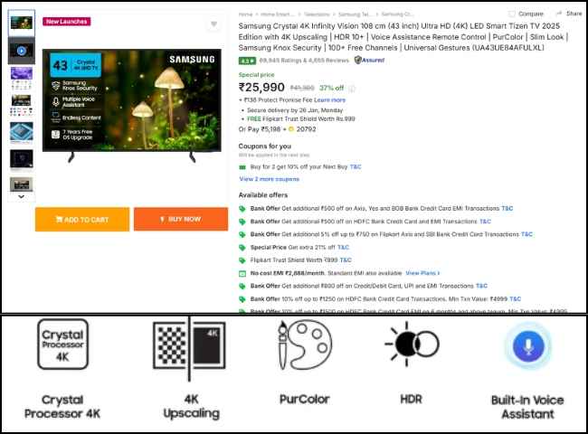 Samsung లేటెస్ట్ 4K Smart Tv ఈరోజు ఫ్లిప్ కార్ట్ లేటెస్ట్ సేల్ నుంచి చాలా చవక ధరలో లభిస్తోంది