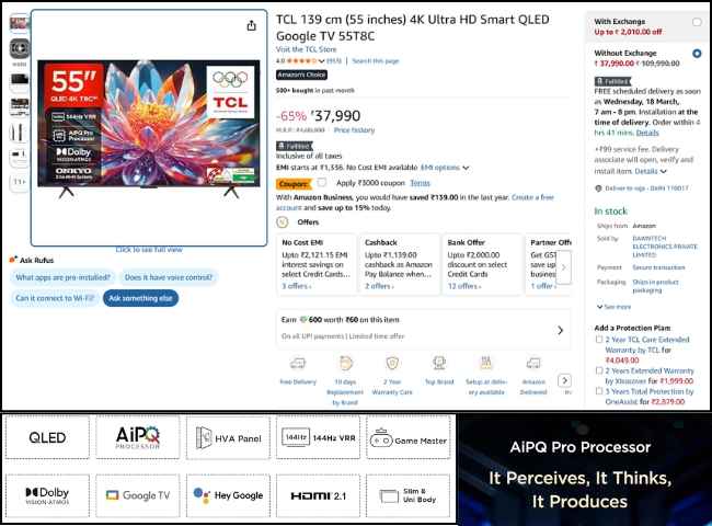 టిసిఎల్ 55 ఇంచ్ క్యూలెడ్ స్మార్ట్ టీవీ 55T8C మోడల్ పై అమెజాన్ ఈరోజు భారీ డిస్కౌంట్ ఆఫర్స్ అందించింది. మొదట ఈ టీవీ పై 65% భారీ డిస్కౌంట్ అందించి రూ. 37,990 రూపాయల ఆఫర్ ధరలో లిస్ట్ చేసింది. ఇది కాకుండా ఈ ఫోన్ పై రూ. 3,000 రూపాయల అదనపు డిస్కౌంట్ అందించింది.