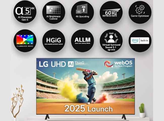 ఈ ఎల్ జి స్మార్ట్ టీవీ 4K UHD రిజల్యూషన్ కలిగిన 55 ఇంచ్ LED స్క్రీన్ తో వస్తుంది మరియు ఇది 60 Hz రిఫ్రెష్ రేట్ కూడా కలిగి ఉంటుంది. ఈ స్మార్ట్ టీవీ HDR 10, HLG మరియు AI బ్రైట్నెస్ వంటి ఫీచర్స్ తో గొప్ప విజువల్స్ అందిస్తుంది. ఈ టీవీ α5 AI Processor 4K Gen6 తో పని చేస్తుంది మరియు 1.5 GB ర్యామ్ తో పాటు 8 GB ఇంటర్నల్ స్టోరేజ్ తో జతగా వస్తుంది.