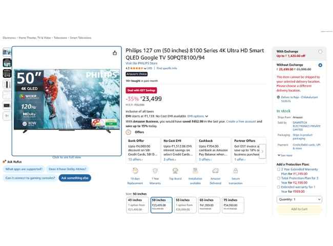 అమెజాన్ గ్రేట్ ఇండియన్ ఫెస్టివల్ సేల్ రెండో రోజుకు చేరుకుంది మరియు ఈరోజు కూడా గొప్ప డీల్స్ మరియు ఆఫర్స్ అందించింది. ముఖ్యంగా, ఈ రోజు స్మార్ట్ టీవీలు చాలా తక్కువ ధరకే లభిస్తున్నాయి. ఇటీవల విడుదలైన లేటెస్ట్ స్మార్ట్ టీవీలు కూడా ప్రస్తుతం చాలా తక్కువ ధరకే లభిస్తున్నాయి. వాటిలో ఒక బెస్ట్ 50 ఇంచెస్ స్మార్ట్ టీవీ డీల్ ను మీకోసం ప్రత్యేకంగా అందిస్తున్నాను. అదేమిటంటే, లేటెస్ట్ గా విడుదలైన 50 ఇంచ్ Philips QLED Smart Tv ఈరోజు అమెజాన్ సేల్ నుంచి భారీ డిస్కౌంట్ ఆఫర్ తో కేవలం 21 వేల బడ్జెట్లోనే లభిస్తుంది. ఈ డీల్ గురించి వివరంగా తెలుసుకోండి.