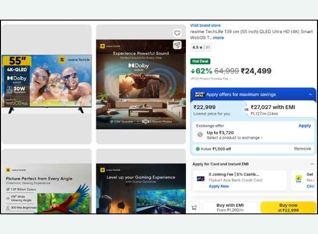 ఈ 55 ఇంచ్ క్యూలెడ్ స్మార్ట్ టీవీ ఆఫర్ ఈరోజు మీకు ఫ్లిప్ కార్ట్ నుండి లభిస్తుంది. అదేమిటంటే, realme TechLife 55 ఇంచ్ స్మార్ట్ టీవీ మోడల్ (55UHDWQRALLQ) ఈరోజు ఫ్లిప్ కార్ట్ నుంచి 62% భారీ డిస్కౌంట్ తో కేవలం రూ. 24,499 రూపాయల ఆఫర్ ధరలో సేల్ అవుతోంది. ఇది కాకుండా ఈ స్మార్ట్ టీవీ పై రూ. 1,500 రూపాయల అదనపు బ్యాంక్ డిస్కౌంట్ ఆఫర్ ను కూడా అందించింది. Kotak బ్యాంక్ క్రెడిట్ కార్డు తీసుకునే వారికి డిస్కౌంట్ లభిస్తుంది.