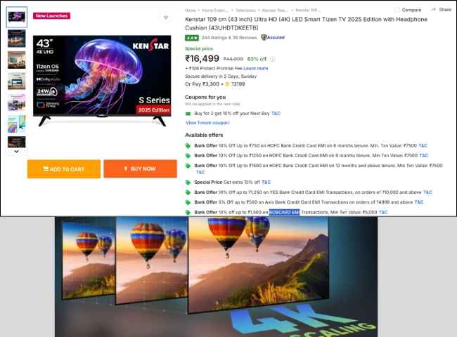 ఈ డీల్ మీకు ఫ్లిప్ కార్ట్ నుంచి మీకు అందుబాటులో ఉంది. ఈ డీల్ ఏమిటంటే, Kenstar గత్ సంవత్సరం చివరిలో అందించిన 43 ఇంచ్ 4K స్మార్ట్ టీవీ మోడల్ నెంబర్ 43UHDTDKEETB పై 63% భారీ డిస్కౌంట్ ప్రకటించింది. అందుకే, ఈ టీవీ ఈరోజు కేవలం రూ. 16,499 రూపాయల డిస్కౌంట్ ధరకేసేల్ అవుతోంది. ఈ కెన్ స్టార్ 43 ఇంచ్ స్మార్ట్ టీవీ పై BOB CARD EMI మరియు HDFC బ్యాంక్ క్రెడిట్ ఆప్షన్ తో రూ. 1,500 అదనపు బ్యాంక్ డిస్కౌంట్ కూడా లభిస్తుంది.